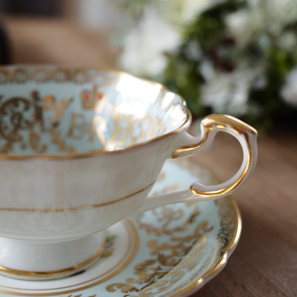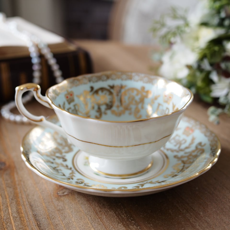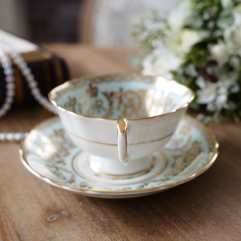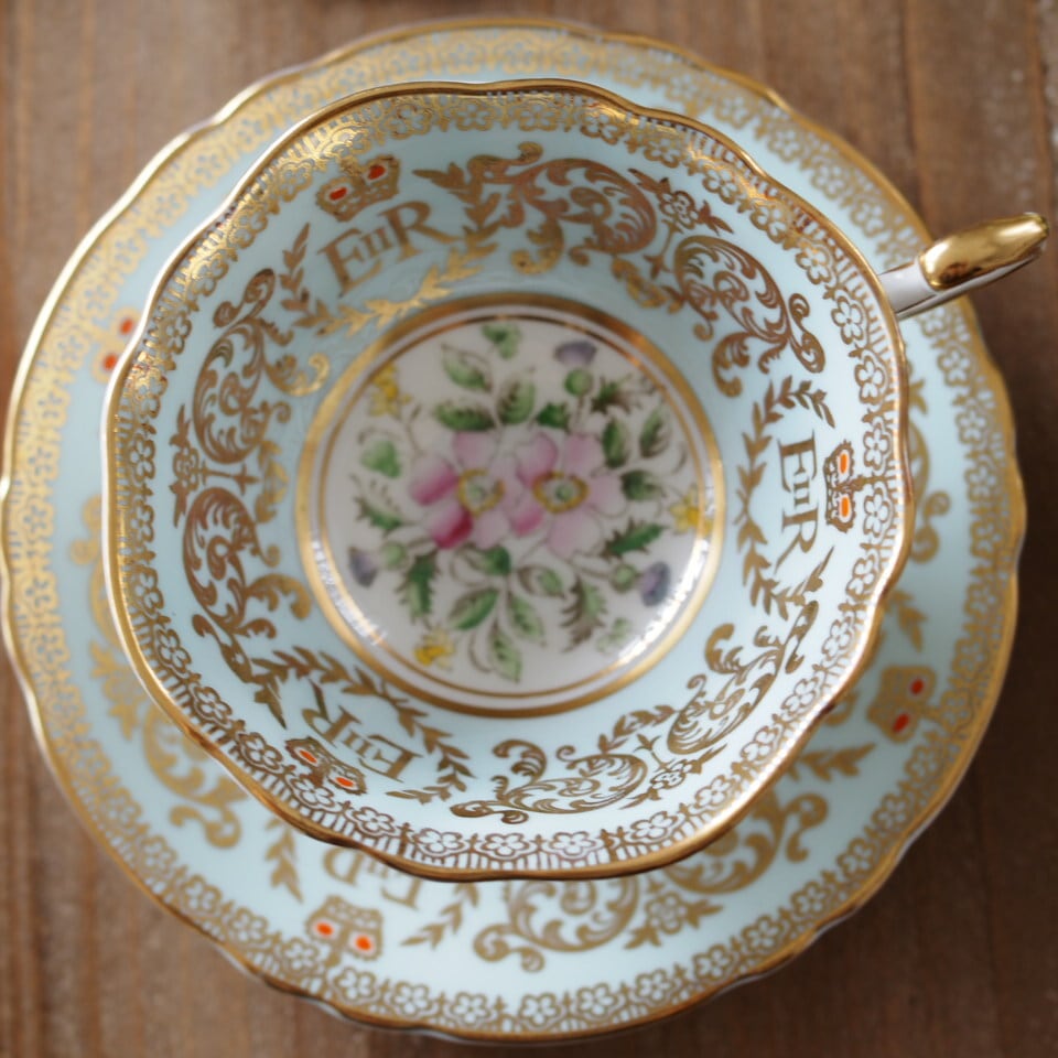 淡い空色の地に、王冠と「EⅡR(Elizabeth II Regina)」のモノグラムが金彩で優雅に描かれ、英国王室らしい格式と華やかさを感じさせます。