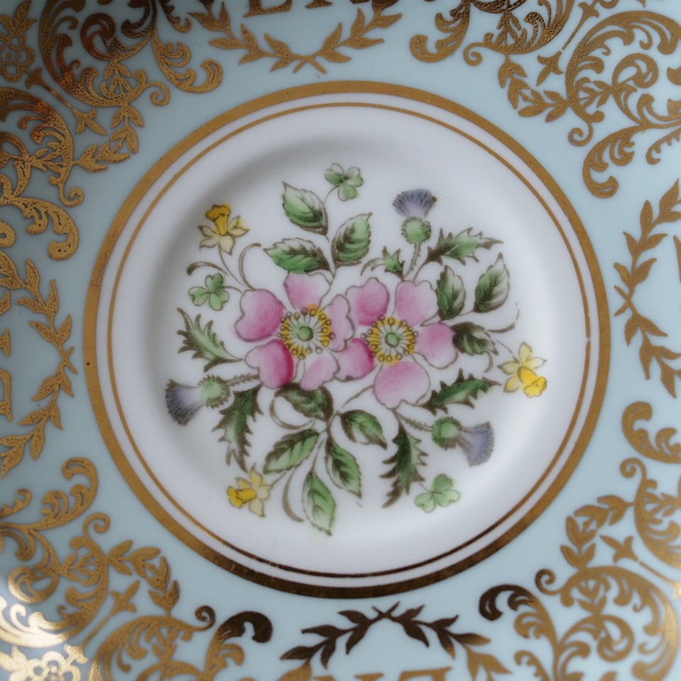 さらにカップとソーサー中央には、可憐な野花のブーケが丁寧に配され、ロイヤルモチーフの中にやわらかな美しさが添えられています。