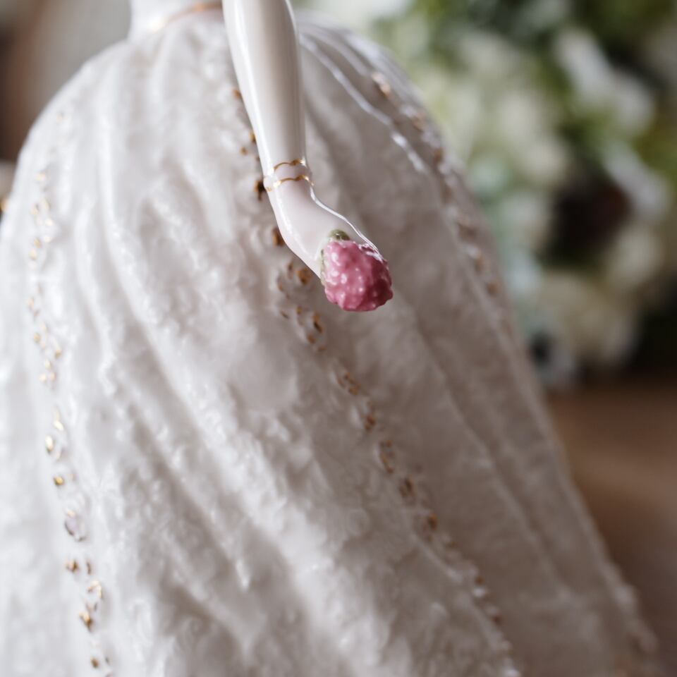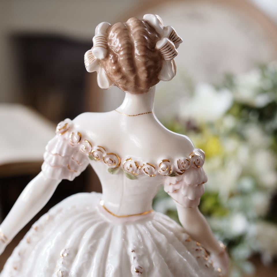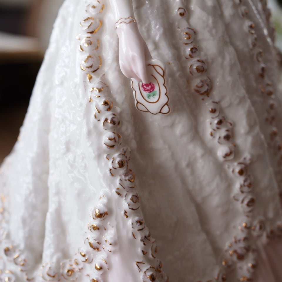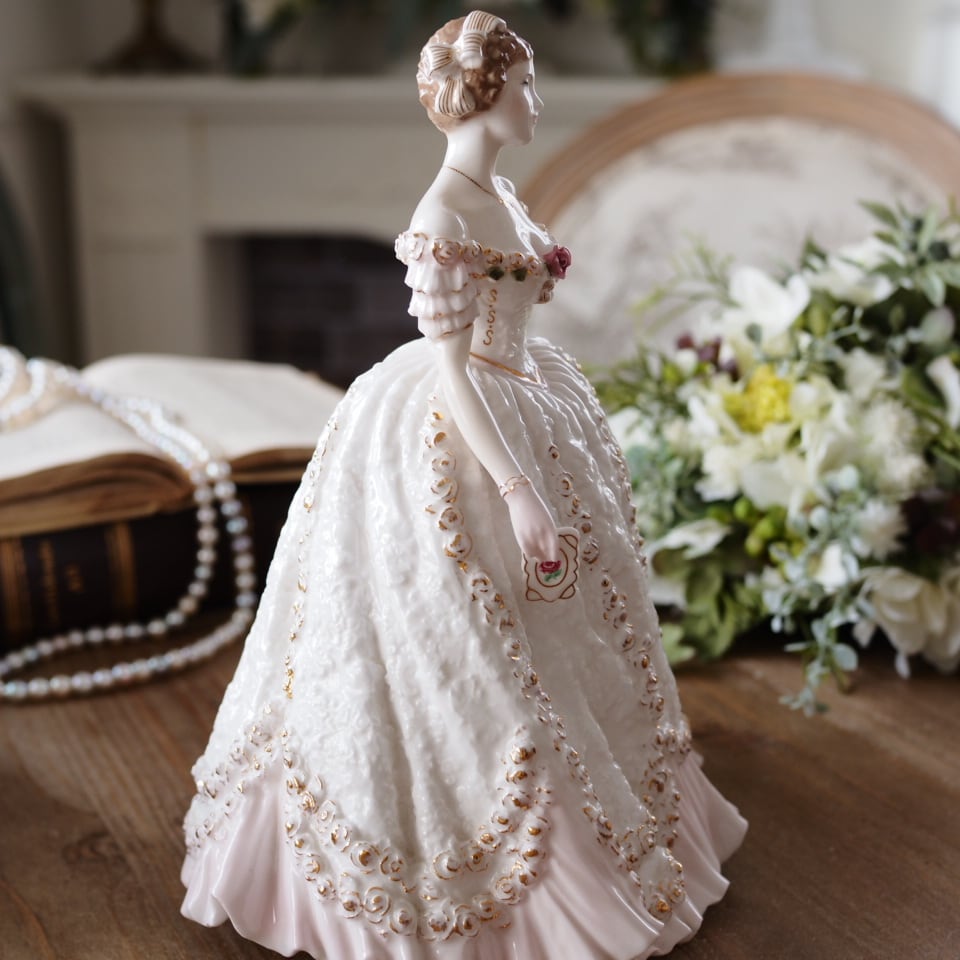 ふんわりと広がるドレスには、繊細なレリーフ装飾と上品な金彩が丁寧に施され、胸元の小さな薔薇や優しい微笑みまで、細部にわたり美しく表現されています。