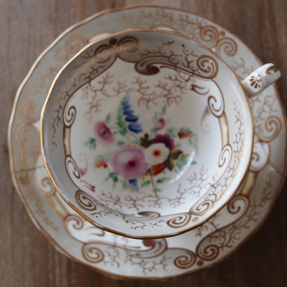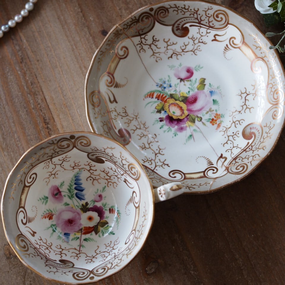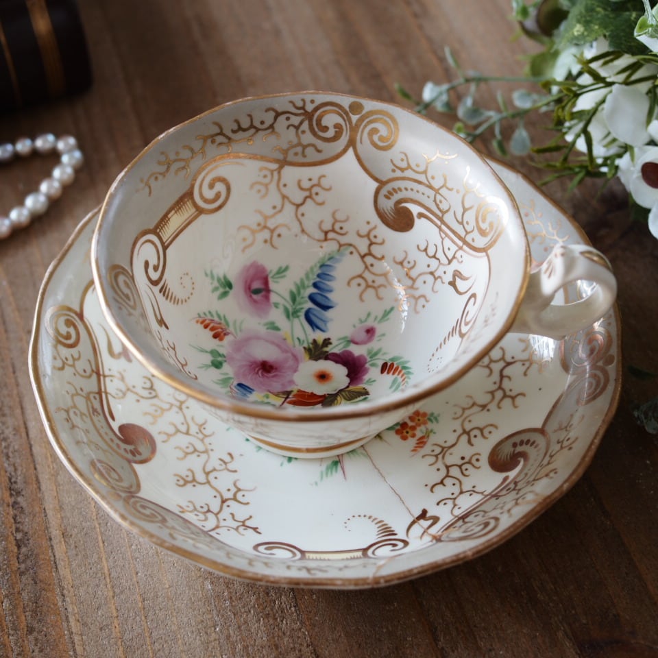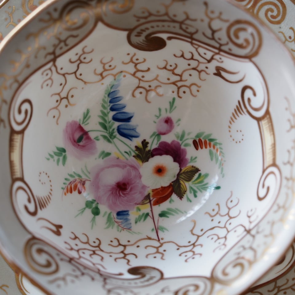 繊細な金彩スクロール装飾と、中央に描かれた可憐な花束文様が美しく、19世紀英国磁器らしい気品あふれる佇まいが魅力です。