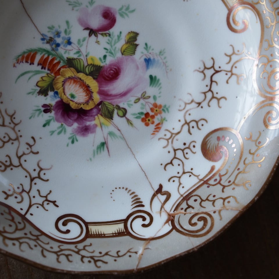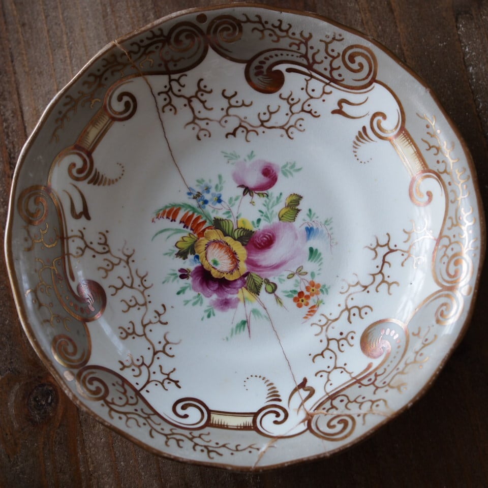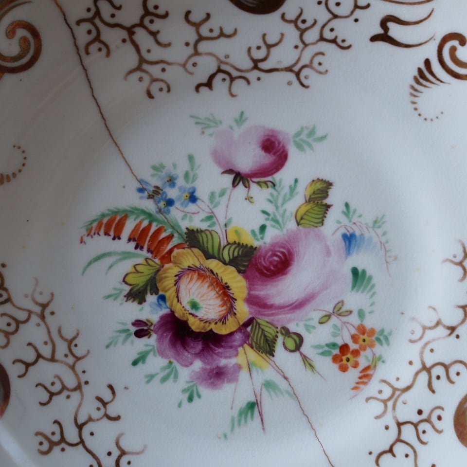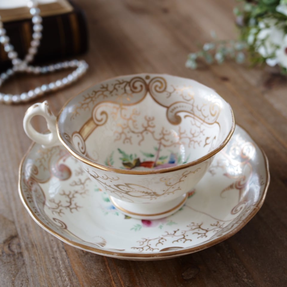 繊細な金彩スクロール装飾と、中央に描かれた可憐な花束文様が美しく、19世紀英国磁器らしい気品あふれる佇まいが魅力です。