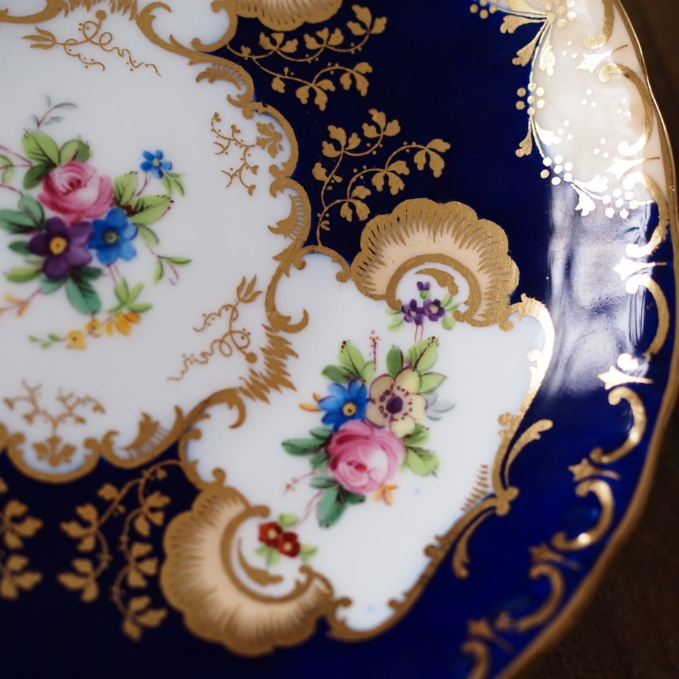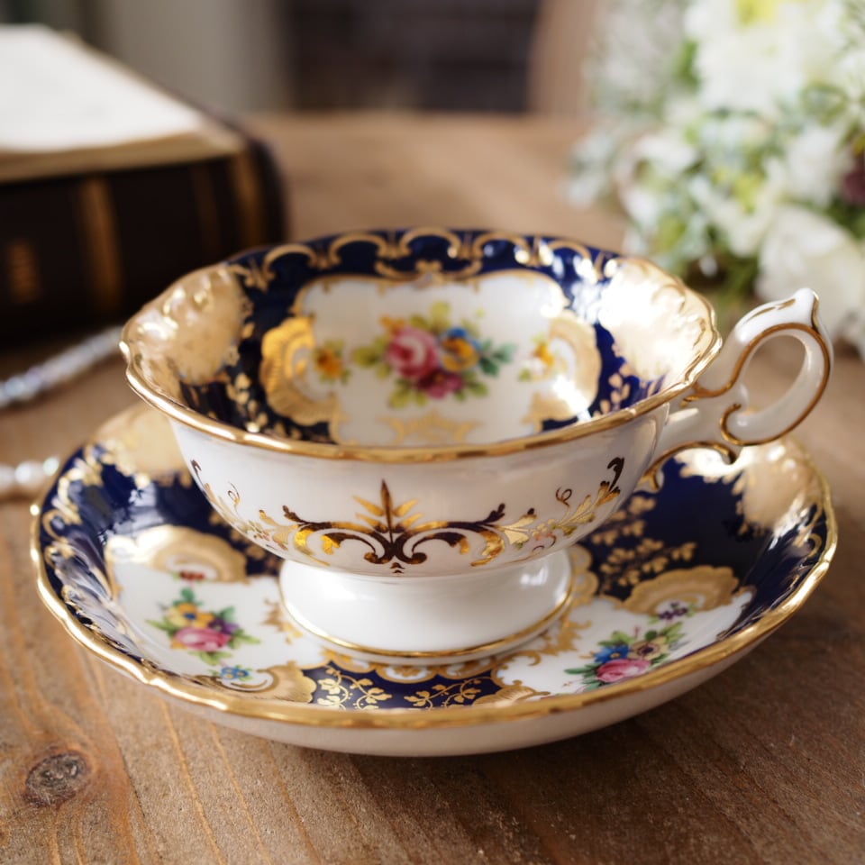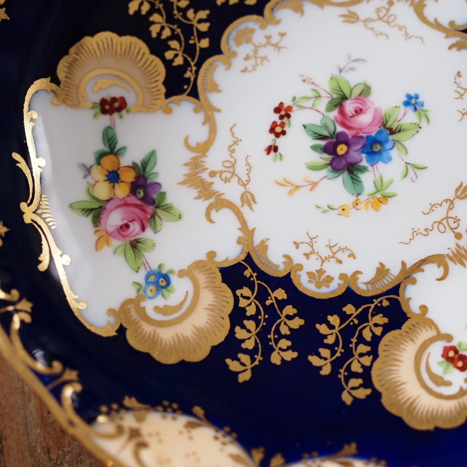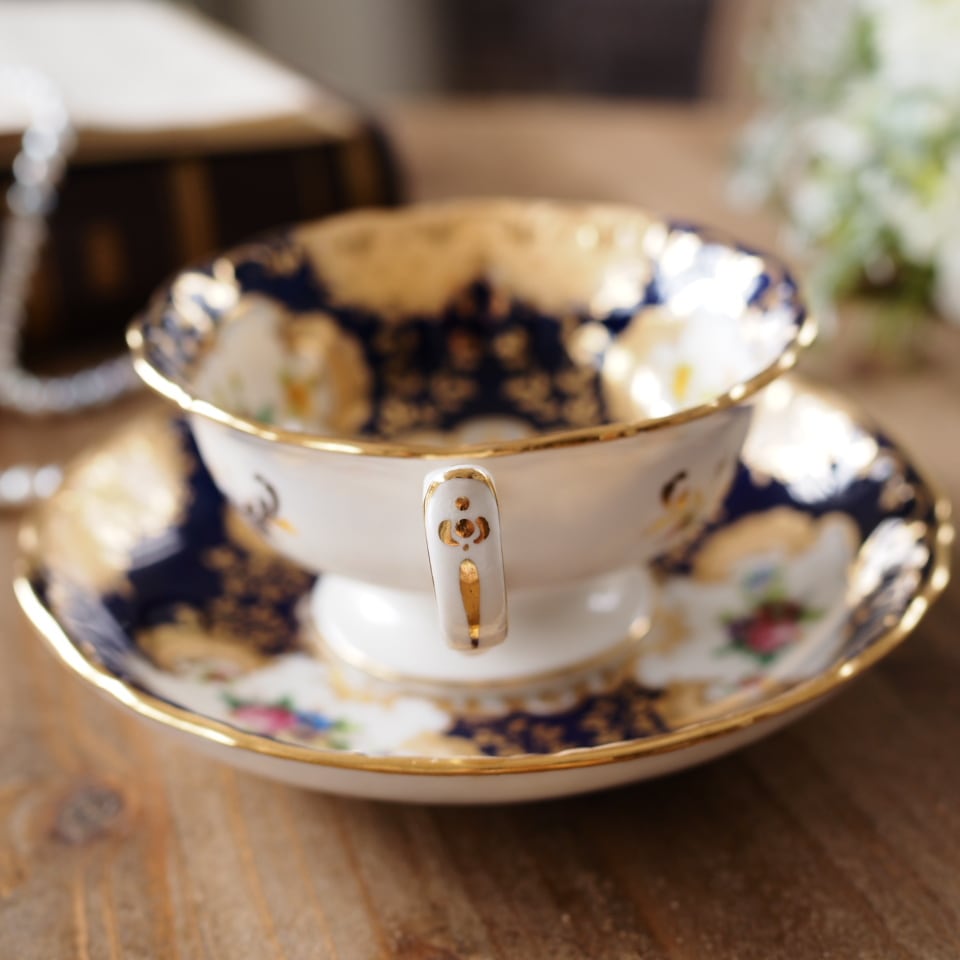 深みのあるコバルトブルーの地に、繊細な金彩装飾と可憐な小花ブーケが美しく配され、