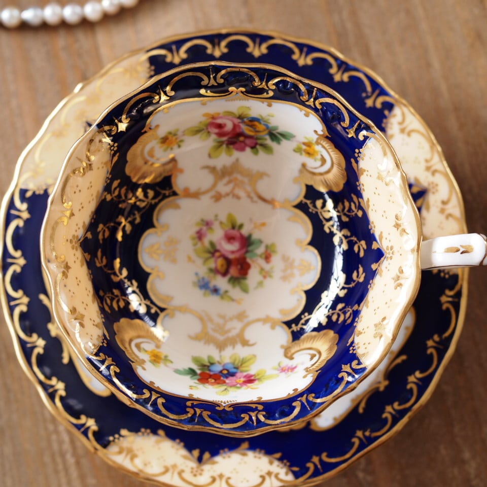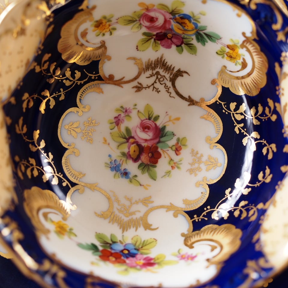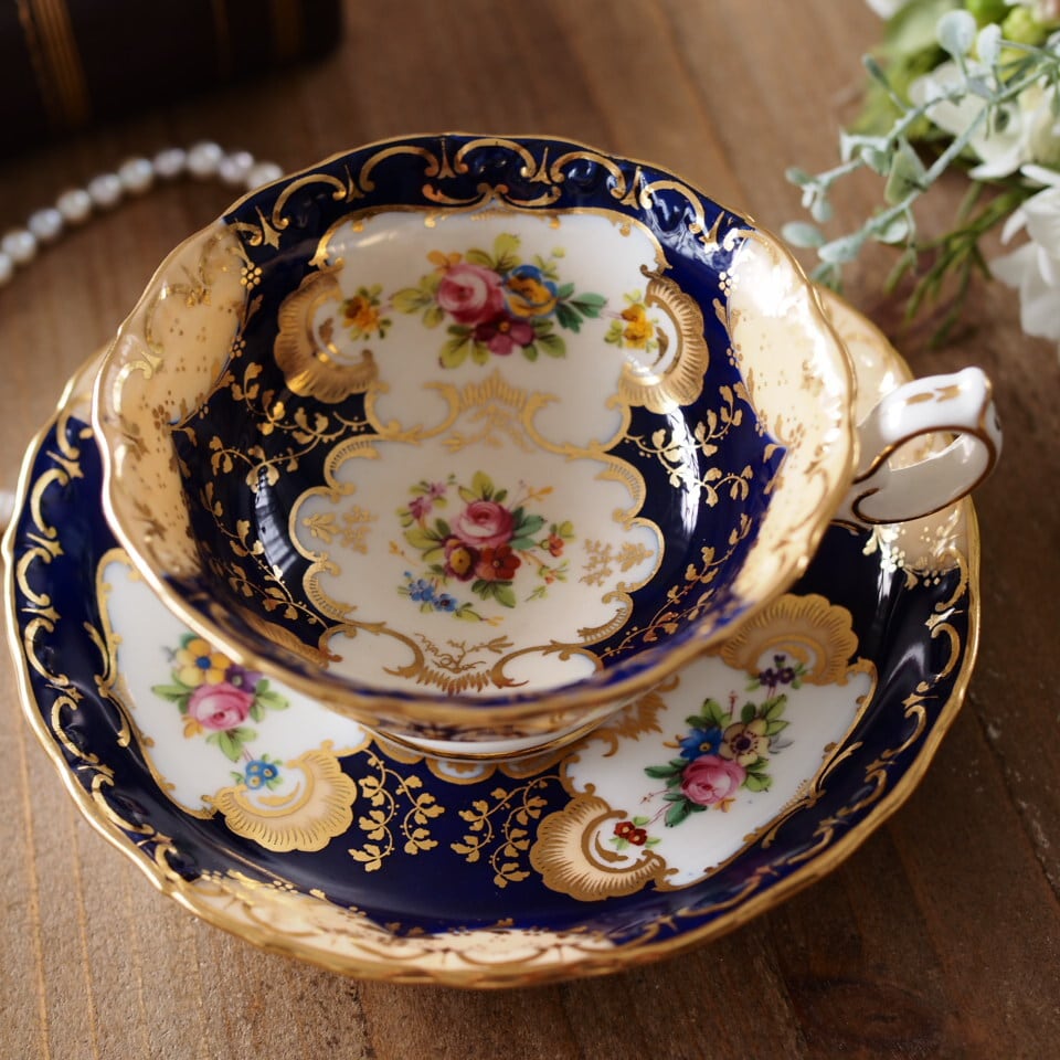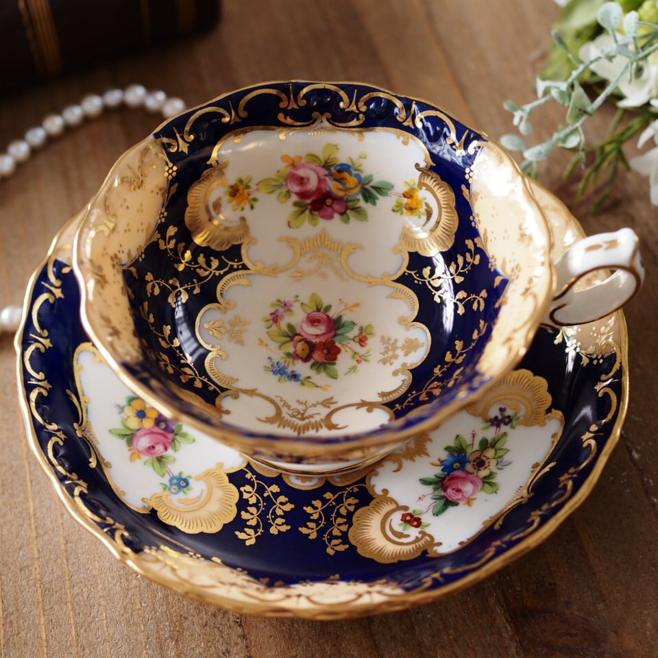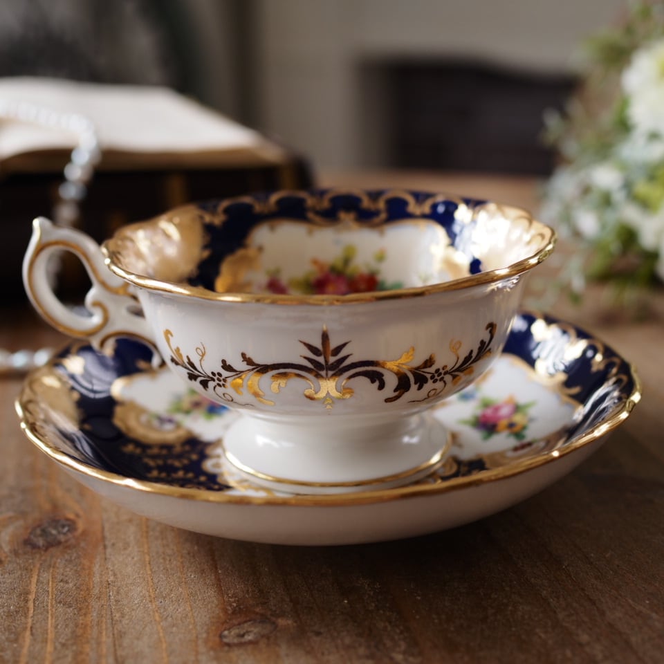 深みのあるコバルトブルーの地に、繊細な金彩装飾と可憐な小花ブーケが美しく配され、