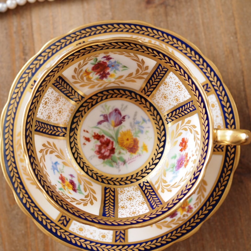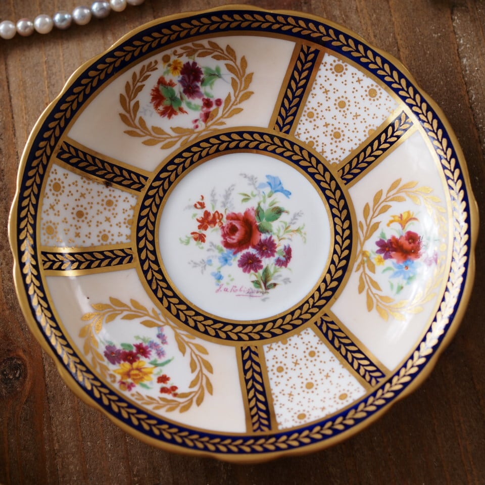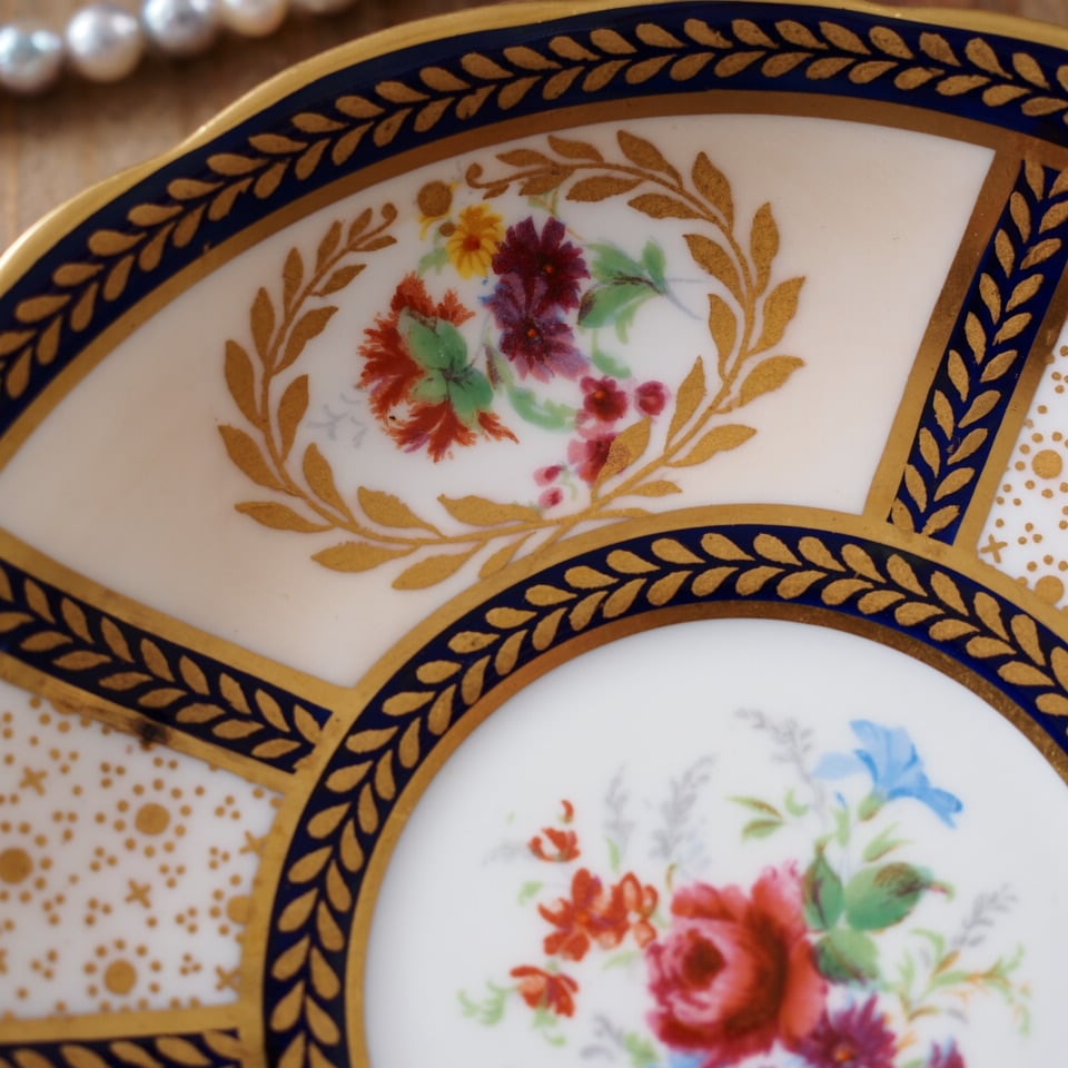深みのあるコバルトブルーと繊細な金彩、そして中央に描かれた華やかな花束装飾。