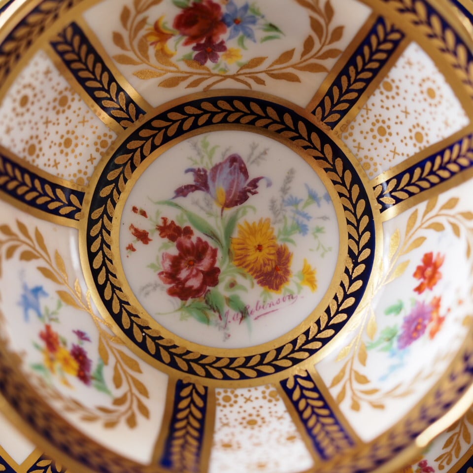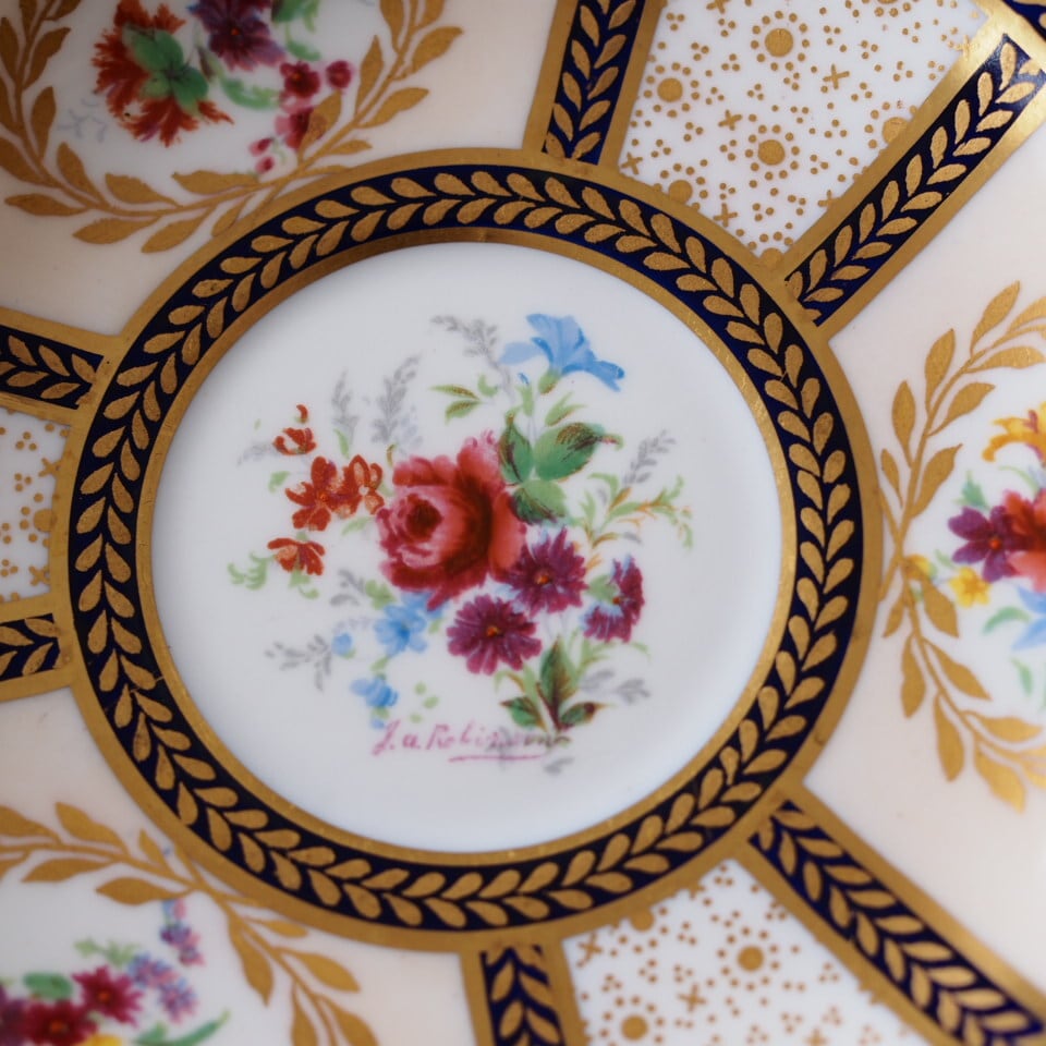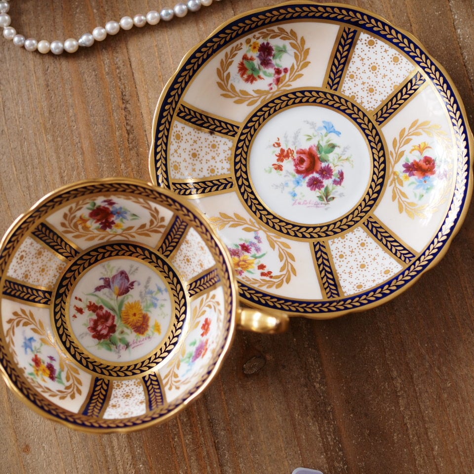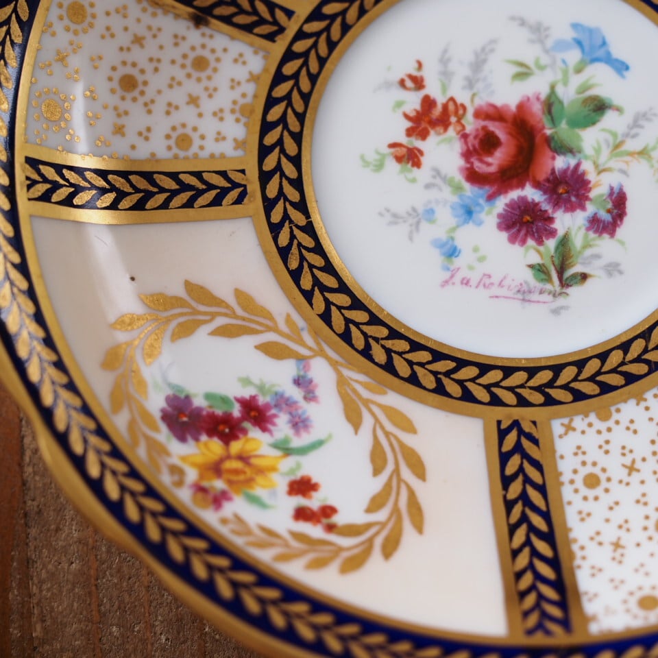 深みのあるコバルトブルーと繊細な金彩、そして中央に描かれた華やかな花束装飾。